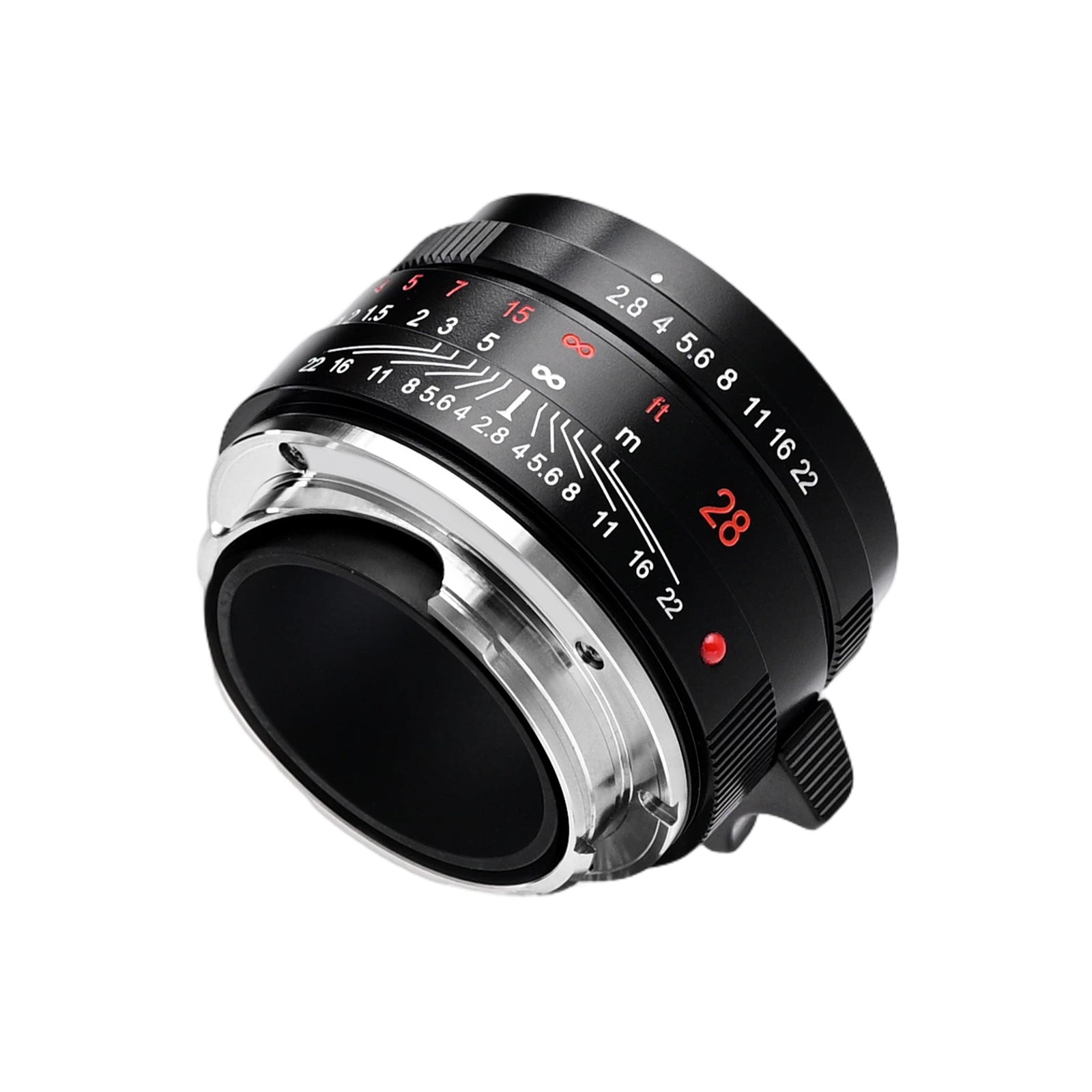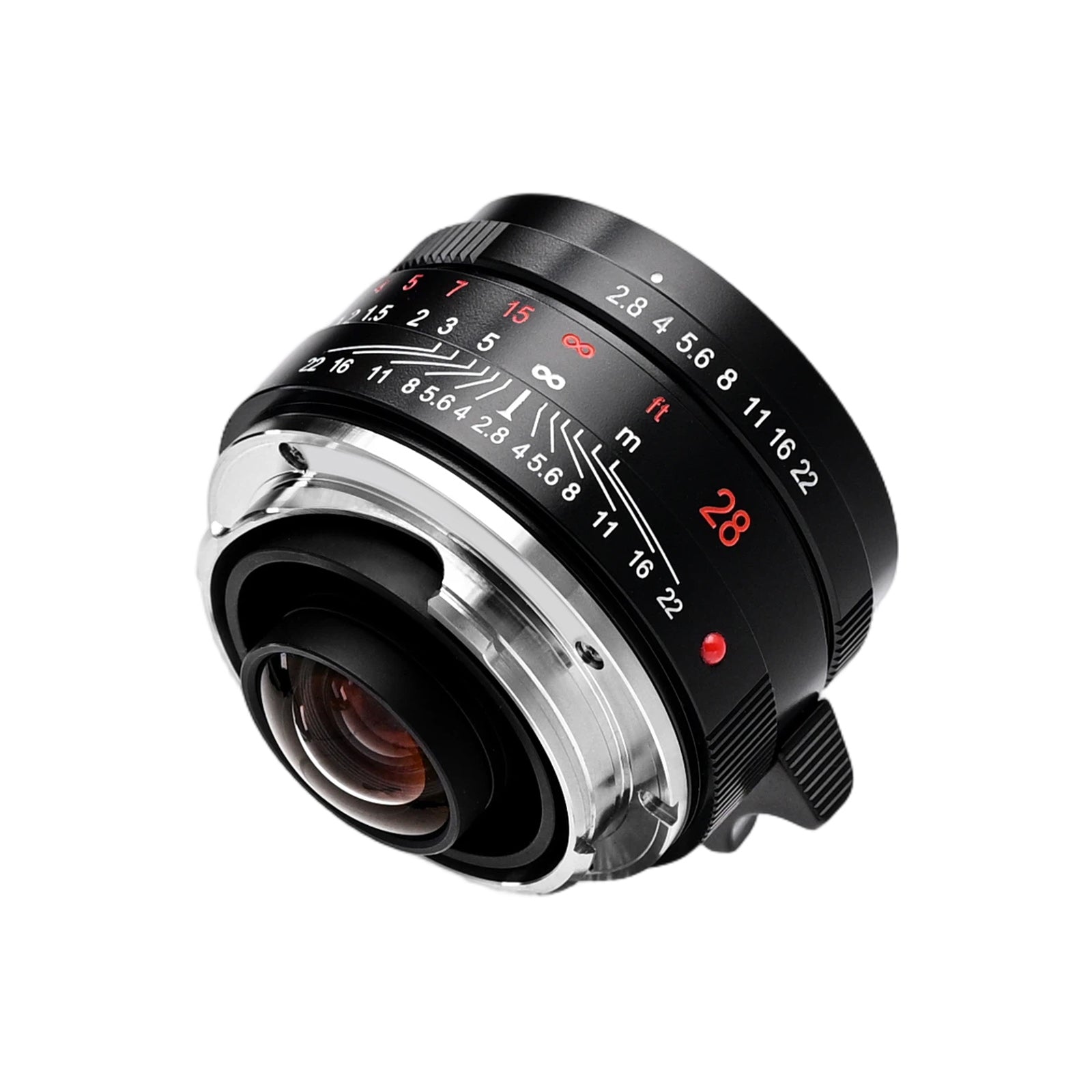 The G28 features a Biogon symmetrical optical design with 7 elements in 5 groups, providing a 75° wide-angle field of view. With a maximum aperture of f/2.8, minimum aperture of f/22, closest focusing distance of 0.5m, 46mm filter thread, and weighing just 150g, this lens exemplifies compact precision.